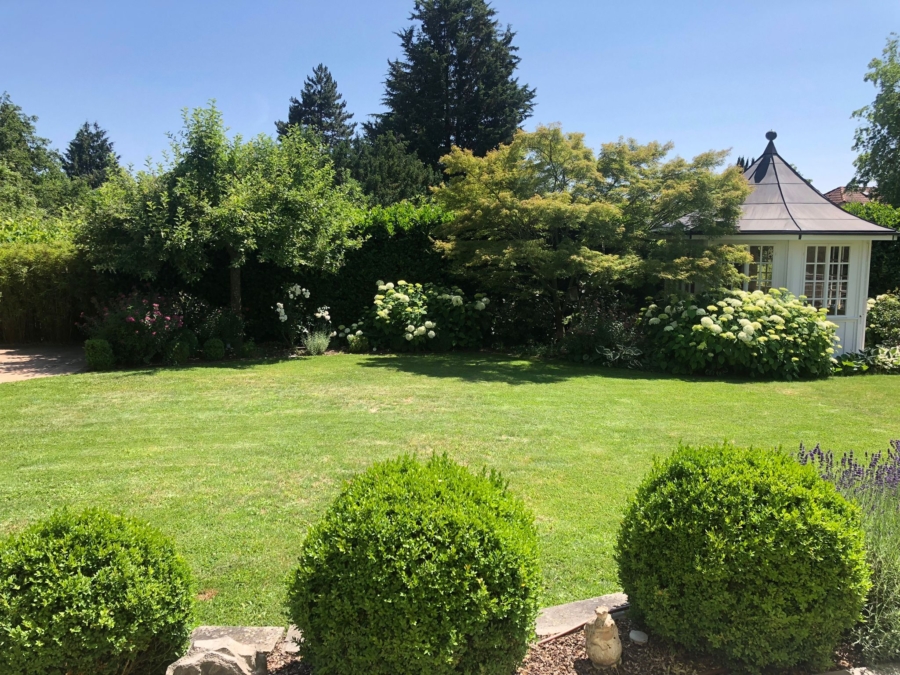 Der Garten selbst ist ein privater, nicht einsehbarer Rückzugsort – Lorbeerhecken, Bambus, gepflegte Beete, Beregnungsanlage, Spielflächen, ruhige Ecken.