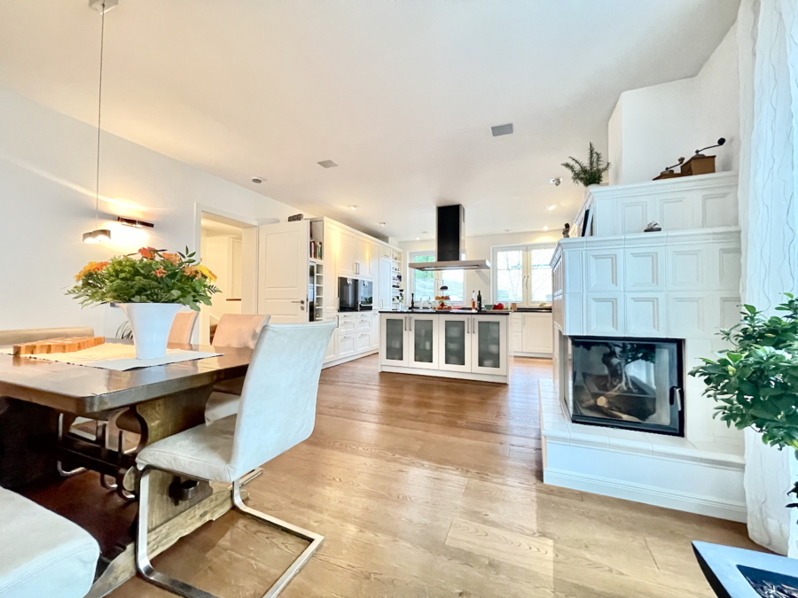 Im Wohnzimmer und in der großen Wohnküche sorgen zwei Kachelöfen mit großen Sichtfenstern für genau die Momente, die ein Zuhause unvergesslich machen: