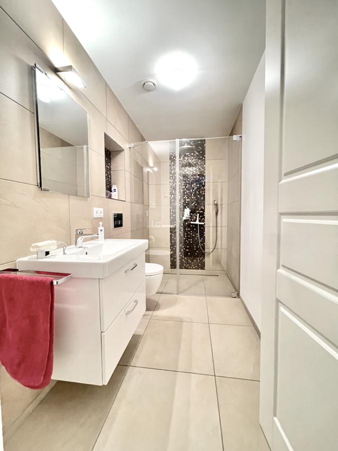Rainshower, Naturstein, helle Räume mit Tageslicht, handwarme Handtuchheizkörper, Sonos-Audio.