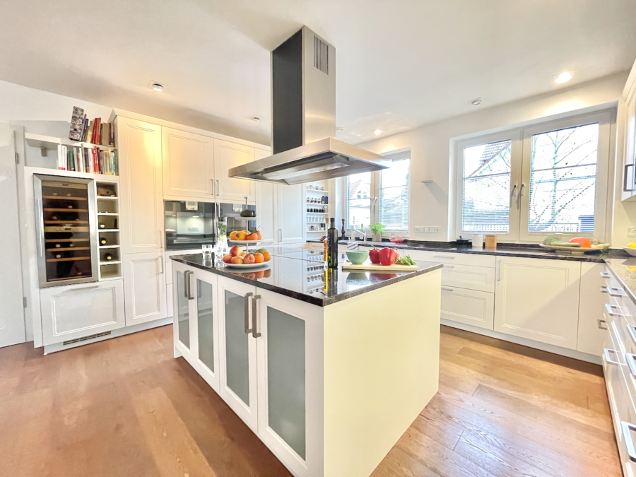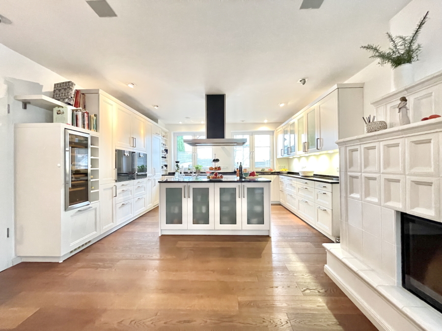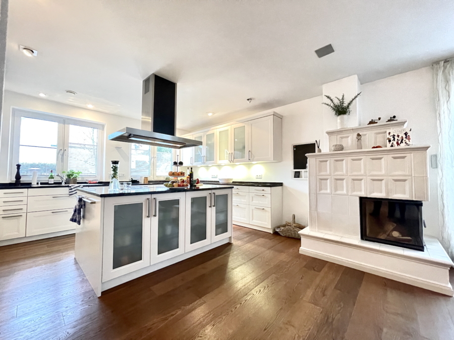 Eine große Kochinsel, Granitarbeitsflächen, hochwertige Geräte, ein Weinschrank und eine Kaminzone, die Kochen wieder zu einem Ritual macht.
