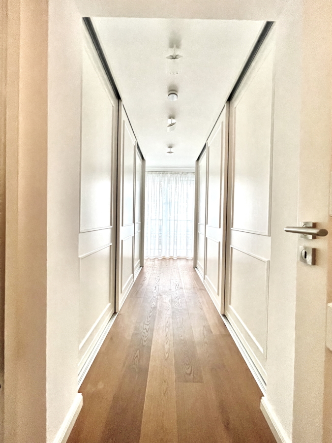 Ölveredeltes Parkett, maßgefertigte weiße Einbauschränke, Naturstein – eine Atmosphäre, die ruhig atmet und gleichzeitig Stil zeigt.