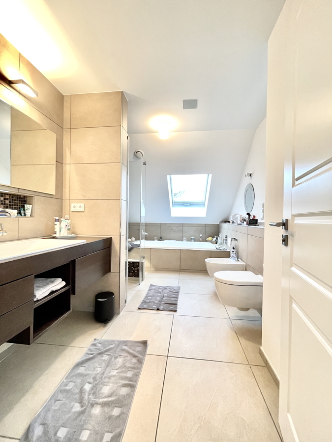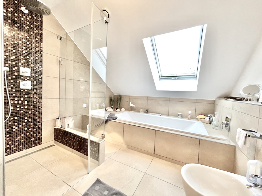 Ein tageslichthelles Bad, direkt angeschlossen – 20 m² Wellness, mit Rainshower, Badewanne, Musik über Sonos.