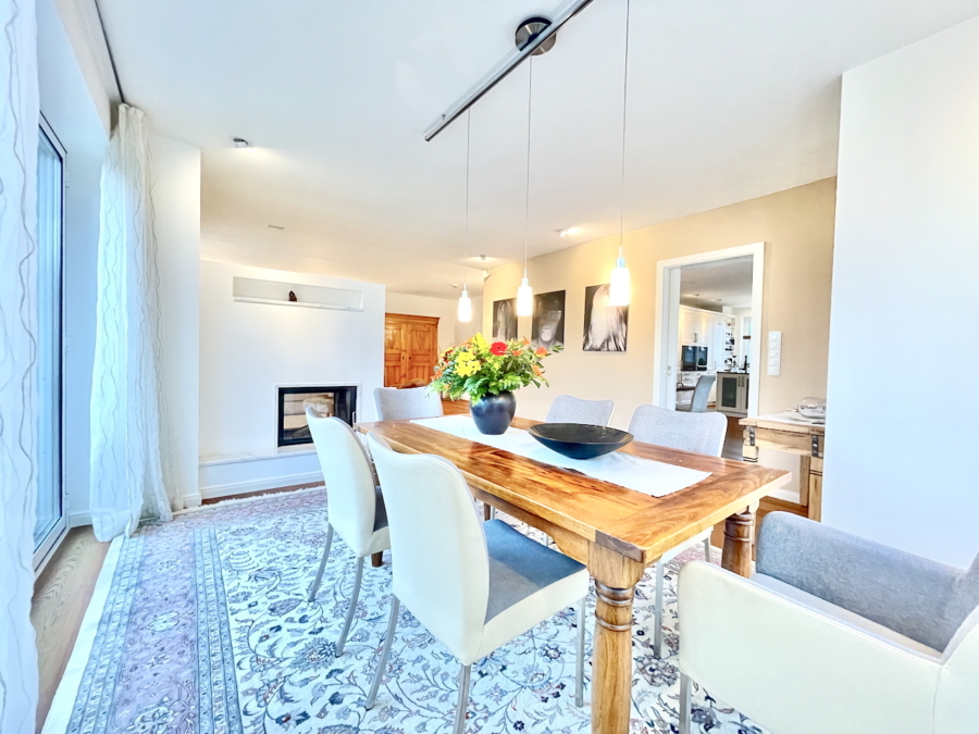 Hier knistert das Feuer hinter einer großen Sichtscheibe, während Sie auf dem Sofa sitzen, eingehüllt in Wärme, den Duft von Holz und einer Tasse Tee. Die Falttüren zur Terrasse erinnern Sie daran, wie offen und lichtdurchflutet dieser Raum im Sommer ist – doch jetzt gehört er ganz Ihnen, Ihrem Rhythmus, Ihrem Abend.