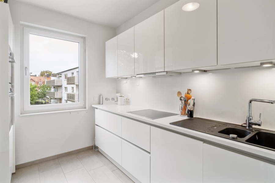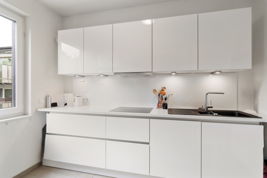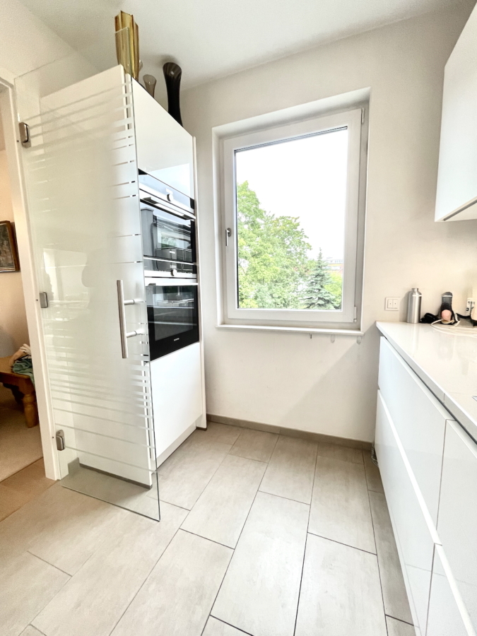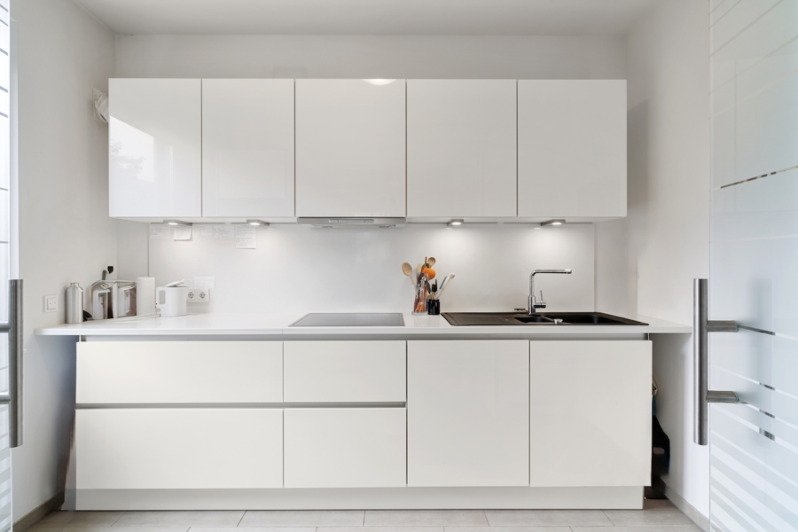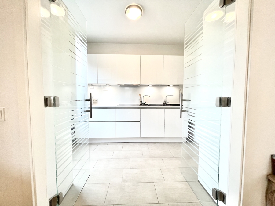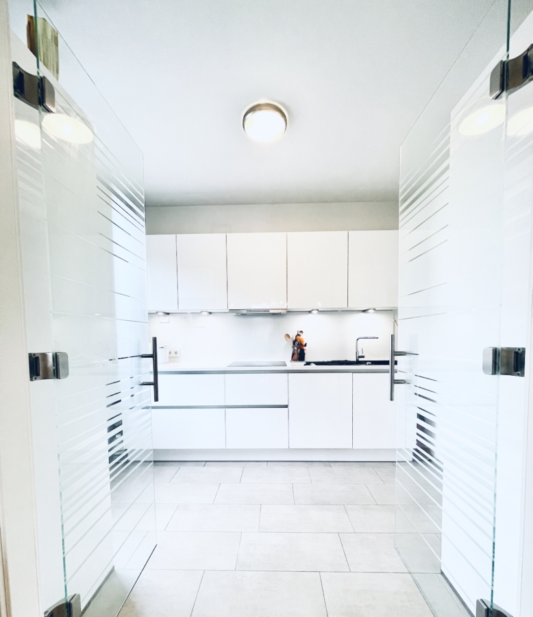 Die Küche – weiß, hochglänzend, elegant durchdacht. Abgetrennt durch Glastüren und doch verbunden mit dem Essplatz. Ein Ort für gesellige Kochabende, für Genuss, für stilvolles Miteinander.